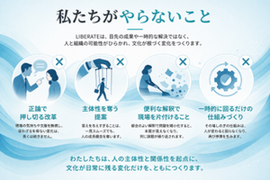 私たちのゴールは、立派な報告書を書くことではありません。私たちが現場を去った後も、クライアントが自分たちの足で歩み続け、変化を日常の文化として定着させていること。それがLIBERATE(解放する)という社名に込めた願いです。