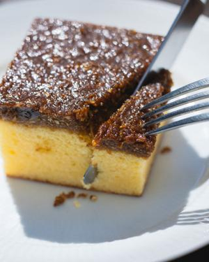 デンマーク伝統のお菓子ドリームケーキ。ブラウンシュガーを使ってカラメリゼしたココナッツをトッピング。