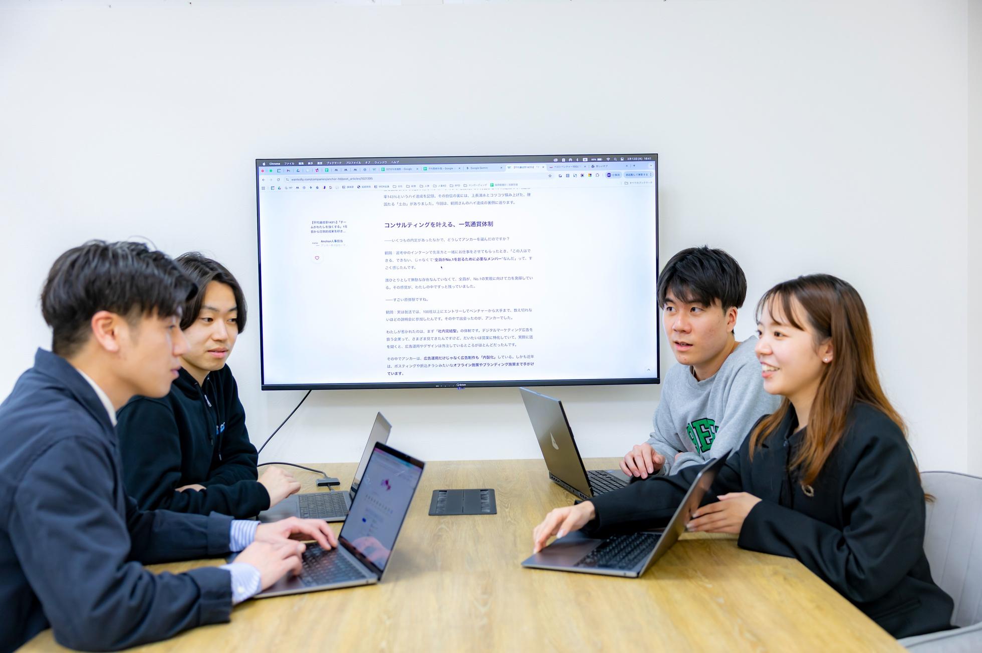▍​​「No.1を創る会社」 広告業界には、無視できない矛盾が蔓延しています。 それは、クライアントの“長期的な成功”より、代理店側の“短期的な利益”が優先されるという現実。 手数料のための広告消化や、本質的ではない数字の報告。 私たちは、そんな業界のスタンダードを真っ向から否定します。 私たちが提唱するのは、一過性の成果で終わらせない「グロースマーケティング」。 目先のKPI達成で満足することはありません。 私たちが執着するのは、事業の最終ゴールであるKGI——つまり、「クライアントの売上・利益の最大化」ただ一点です。 誰もがやらない領域まで愚直に、圧倒的なプロ意識を持ってやり抜く。 クライアントを市場No.1へ導き、その熱狂の渦中で、私たちAnchor自身もまた圧倒的な成長を遂げる。 「共に勝ち、共に大きくなる」というこの正攻法こそが正しいのだと、自らの背中で証明し続けること。 それが、「価値の追求」をミッションに掲げる、私たちの揺るぎないスタンスです。 ▍グロースマーケティングを叶える、一貫支援体制 「集客はA社、CRMはB社、制作はC社…」戦略を分断させ、成果を逃します。だからこそ、私たちは手段を限定しません。 運用型広告(リスティング・ディスプレイ・アフィリエイト等)やクリエイティブ制作はもちろん、CRM、顧客DB設計、EC運営支援、CM施策、ポスティングなどのオフライン施策まで。クライアントの事業成長のためなら、あらゆる領域を横断し、一気通貫で実行します。 私たちの支援は、決して「机上の空論」ではありません。 実際に市場No.1を創出した実績はもちろん、時には自らリスクを背負い、出資を伴うマーケティング支援にまで踏み込む。アドバイザーという客観的な立場に安住するのではなく、事業の苦しみも喜びも、クライアントと共に味わい尽くす。「もはや境界線が分からない」と、語る社員がいるほどの泥臭い当事者意識。 その圧倒的な顧客理解こそ、市場No.1を創り出すアンカー独自の強みです。 ▼クライアントインタビュー 【立上げ3ヶ月平均売上前月比157%成長】事業立案、出資、マーケティングまで一貫支援。買取専門店uruuruとAnchorの新たな挑戦とは。 https://www.wantedly.com/companies/anchor-ltd/post_articles/942552 ▍市場No.1の創出 私たちが生み出す「市場No.1」は、単なる戦略の産物ではありません。 「No.1を創る」という圧倒的な目標に対し、How Can(どうすればできるか?)思考で問い続け、泥臭く手足を動かし、粘り強くやり抜いた執念の結果です。 過去には支援開始時はわずか6店舗・月商3,000万円だった事業を、2年で100店舗・月商20億円超へと導いた実績もあります。机上の空論で終わらせず、現場の最前線でクライアントと共に足掻き、勝ち筋を執念で手繰り寄せる。それが私たちのスタイルです。 ▼クライアントインタビュー 「メンズ脱毛業界No.1実現」クリアがAnchorを“最高のビジネスパートナー”と呼ぶ理由とは。 https://www.wantedly.com/companies/anchor-ltd/post_articles/912277 【ネットオリパ売上No.1達成の裏側】“最後の頼みの綱”だった。日本トレカセンターが、Anchorと駆け抜けた2年半。 https://www.wantedly.com/companies/anchor-ltd/post_articles/992412 ▍6年連続ベストベンチャー100選出 https://www.wantedly.com/companies/anchor-ltd/post_articles/1035699 ※「ベストベンチャー100」は、イシン(株)が提供する法人向け有料会員制サービスです。エントリーした企業の中から、厳正な審査のもと選出したベンチャー企業100社が「ベストベンチャー100」として紹介されます。