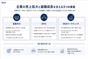 IN-Bは、営業代行、採用業務支援 RPO、WEBマーケティング支援を通じて、企業の売上拡大と組織成長を支援している会社です。
