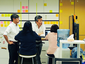 スタンディングデスクで、、次の1週間の仕事の優先順位を話し合うmtg。