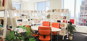 図書スペースには、代表や社員が推薦する本が並んでいます。お昼休憩の際やミーティングで自由に使用できます。