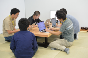 畳のミーティングスペースでリラックスした雰囲気で打ち合わせをしています。