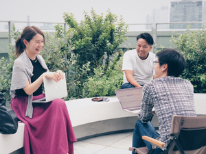 社内ミーティングの様子。ホワイトボードを使わないようなミーティングでは、気分を変えて屋上で行うこともあります。