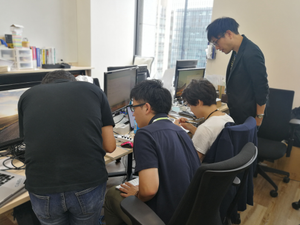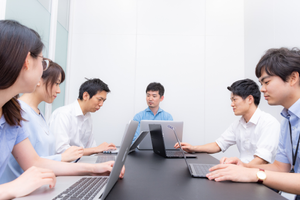 会議室にて、メンバーで週次MTGをしている様子です。最近はリモートTV会議も増えてます。