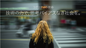 ■認知バイアスを取り除く 私たちは「技術の力で、思考バイアスなき社会を。」をミッションとしています。 「UpSighter」の開発のきっかけは、人間の「思考バイアス」、つまり思い込みをなくしたいという思いから生まれました。 自分にとって最善だと思えたことも、他の人に聞いてみると違う選択にすべきだったと後悔する・・・ そのような経験は誰しもあるのではないでしょうか。そこには思い込みや近視眼的判断など、人間が持つ「認知バイアス(思考限界)」との葛藤が存在しています。 代表の河野は14歳の中学生ながらwebサービスを立ち上げ、その頃から"中学生だから"、"女性だから"などという偏見のない人々にたくさんのチャンスをもらってきました。 その後、18歳での起業や大企業での経験をしていく中でも、たくさんの「バイアスに囚われずに判断をしてくれる人」のおかげで、ここまで歩みを勧めてくることができました。 そんな経験から、「思考バイアスをこの世界からなくすことができれば、もっとたくさんの人にいろんなチャンスが降ってくるのではないか」と考え、技術の力を使って、その世界一難しい課題に挑戦することにしました。 技術の力で、思考バイアスなき社会を――。 これがコグニティのミッションです。 人間は生物としての限界をテクノロジーで克服してきました。 それにもかかわらず、まだテクノロジーでも解決できていないのが「思考の限界」です。 人の思い込みや、固定概念などのバイアスは、円滑で、良質なコミュニケーションコミュニケーションを阻害します。 私たちは「UpSighter」によって、バイアスによるコミュニケーションの損失を少しでも減らしたいです。