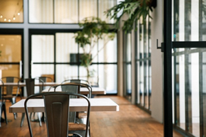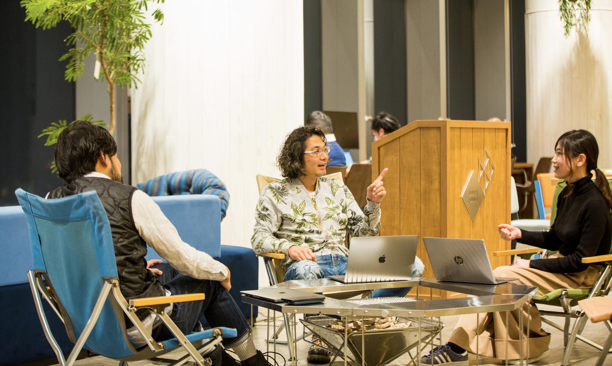共創カフェは天井が高く、全面窓なので心地の良い空間。クライアントやメンバーと特別なコーヒーを飲みながら、時には議論が白熱しています。