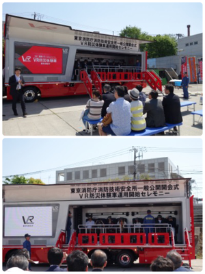 東京消防庁よりVRを活用した防災体験車、愛称は「VR BOSAI」 当社は、VR関係のシステム設計、MX4Dのプログラム制作などをお手伝いしました。