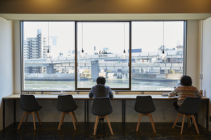隅田川沿いのリノベーションオフィス。スカイツリーや花火、船舶などが見えるリバーサイド席(フリーアドレス)