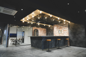 照明とレンガ壁が特徴的なアドケイトのレセプションエリア。黒い波型カウンターと木格子天井が印象的な入口空間。