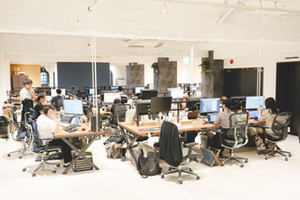 明るく開放的なオープンオフィス空間。社員が集中し業務に取り組む職場環境。