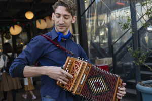 大阪 天王寺の青いナポリインザパークの店長ドナートは、ユニークな接客とオルガネット演奏が得意。イベントでは引っ張りだこ!