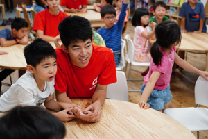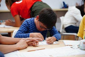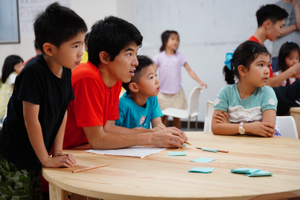 少人数制、ワークショップ形式が特徴のクラスです。ファシリテーター(講師)に加え、各テーブルにメンター(大学生インターン)がつき、生徒一人ひとりの学びを丁寧にサポートします。