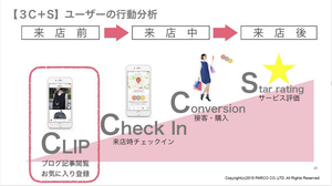 アプリを軸にしたユーザーの行動分析:➀来店前→ショップブログの閲覧とクリップを促進。➁来店時→PARCO来店時のチェックインで、入店を把握。➂来店中→接客や購入などのコンバージョンを記録。④来店後→接客のサービス評価を星の数とコメントで取得。