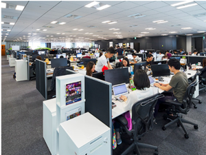 渋谷オフィスの様子。クリエイティブな環境を目指す執務エリア。開放的でシャープな空間です。 ※2020年2月移転前のオフィスです。