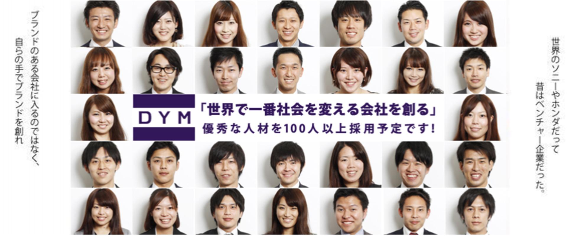 私たちDYMは「1000年後にも存続する会社」を目指しています。 ベンチャーというと常に攻めることだけを優先的に行う会社と思われがちですが、DYMは「絶対に潰れない戦いをする」をテーマにしています。 そのため、どんな不況や環境の変化があってもDYMとして継続できるように最大限の努力を行っています。 このため単一事業ではなく複数の事業を行う事を美徳と考え、DYMでは毎年3~4事業新しい事業を立ち上げています。 財務基盤に関しても自信を持っており、DYM創業以来実質無借金経営で屈強な財務基盤が当社の誇りです。 またDYMの魅力は、『人』とその『社風』にあります。 目指す目標が高く個々にしっかりとしたビジョンがあるので、社会人2~3年目であったとしても実績を上げた人間には責任感のある仕事を任せていく社風があります。 下記に表す【9つの心得】は、DYMのこんな仲間と一緒に働きたいという想いをカタチにしたものです。 【9つの心得】 「素直」柔軟な心と頭で人の話や事柄を受け止められること。 「前向き」常に可能性を信じ積極的であり気持ちが明るく将来に向かっていること。 「一生懸命」自らの限界に挑戦し手を抜くことなく真剣に取り組むこと。 「集中」全メンバーが集中できる環境づくりを心がけるだけでなく自身のミッションにすぐに取り掛かること。 「責任感」あらゆる障害・困難を克服して完遂しようと努力すること。 「礼節」他者に気配りの心と敬意を持ちそれにふさわしい行動・言葉・表情・動作で表すこと。 「感謝」謙虚な心をもって他者を尊重しありがたく思いそれらを表現すること。 「向上心」自分自身の進歩を目指しそのための努力をすること。 「元気」元気な挨拶をし笑顔で接すること。 これから入社するあなたに求めるのは「今できているか」ではなく、まずはこの「想いに共感できるか」。 私たちの評価基準の一つであるこの「9つの心得」に共感し、共に高め成長し合える仲間を求めています。