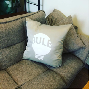 BULBロゴ入りクッションです!オフィスのいたるところにノベルティ商品があるかも?
