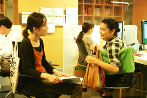 大阪オフィスの様子。会社の男女比はほぼ1:1。主婦や育児をしながら働く女性も多く、会社としてもいろいろな働き方をサポートしたいと思っています。