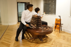 オフィスのベンチ。購入したアンティークショップのオーナーによるとミャンマーの駅のベンチだったみたいです。