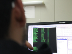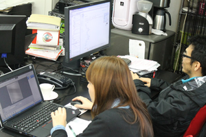 最近、移転して少しだけ広くなりました。この写真は移転前のやつなんですけど、ひとつの机に2~3人で仕事してました…