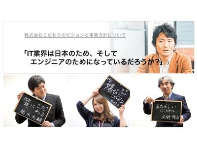 ---事業内容--- 【IT業界のボーダーレス化に挑戦する企業】 株式会社こだわりの代表、小島はSI/SES業界に在籍した経験から、その構造に疑問を呈します。 「IT業界は日本のため、そしてエンジニアのためになっているだろうか?」 SI/SES業界の実態として、A社に在籍しているエンジニアをB社がアサインするとB社は「人材確保」できますが、A社は「人材難」になります。新たにA社がC社から「人材確保」すると、C社は「人材難」になるという椅子取りゲームの状態となっています。 このように、エンジニアのスキルや経験を適切に活用できていない現状を問題視し、株式会社こだわりは、働き方の多様性や雇用機会の創出をすることで、エンジニアと企業の両方がWin-Winな関係を築くことを目指しています。 ①SES事業 [お客様・エンジニアへの提案型事業]  株式会社こだわりは、SES事業を通じて、お客様への価値提供とエンジニアのキャリアアップを両立させることを目指しています。単なる「人材供給」ではなく、お客様の課題解決に向けた提案型のSES事業を展開し、エンジニアがスキルアップできる案件にも積極的に参画しています。 ②SI事業  [地方創生事業への取り組みからSIerへの昇華]  株式会社こだわりは、SI事業を通じて、地方創生やDX化の促進も目指しています。IT格差が存在する地方においても、情シス代行事業を展開することで、企業の業務効率化や顧客満足度の向上を図ります。 ---こだわりの強み--- 【SES事業による依存しない経営体制】 株式会社こだわりは、製品に依存しないSES事業のため、ご提案と技術による価値提供を行うことでお客様に新しい価値を提供しています。また、各々のキャリアの自己実現に対応するため、金融、保険、小売りなど、幅広い業界の案件に積極的に参画しています。
