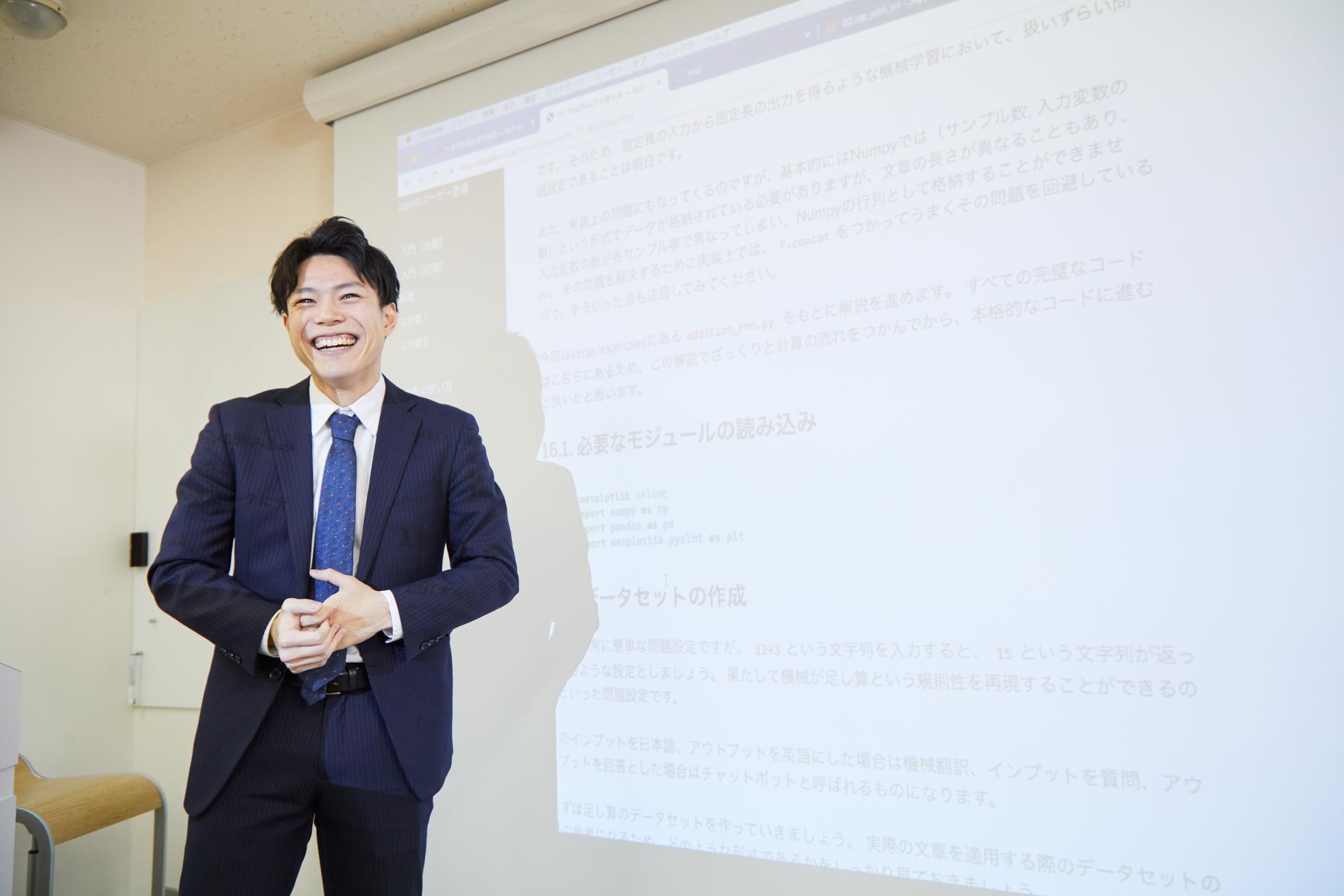 株式会社キカガクの代表取締役CEOをしています。 舞鶴高専、京都大学大学院を卒業して、ITベンチャーへエンジニアとして就職した後、日本にはテクノロジー分野の専門性の高い教育者が不足していると感じ、この人材育成を手がけるキカガクを2017年に創業しました。 AIを含めた新しいテクノロジーを学ぼうとした時に、書籍やWebでは知識が断片的にしか存在せず、またどのような順番で学べば良いのかわからない課題を感じています。 キカガクではこの課題を解決するために、学ぶ人に合わせた適切な難易度や学ぶ順番といった知識を体系化することに挑戦しています。 また、社会人では資料があってもなかなか時間をとって学べないといった別観点の学びに関する悩みもあり、これを教え方に徹底的にこだわった講師がオフラインの研修でわかりやすく伝える事業も行っています。 研究者のようなプロもいれば、教育者のプロも必要なはずです。 専門性の高い領域ではどうしても「研究者=教育者」となってしまいがちですが、キカガクでは教育者のプロとして、学びの支援に力を入れています。 キカガクでは、この教育に対する熱い志を持ったメンバーが集まってくれています。 教育は小学校に入る以前から始まり、大学を卒業した後も生涯にわたって寄り添い続けます。 しかし、その長きに渡る教育で人生に大きな影響を与えられたことが何回あるでしょうか。 私は高専も大学も、そして社会人になってからも尊敬する先生や先輩が見つかり、人生が好転する機会を得ることができましたが、それも人生の中では一握りの方々であり、もっと教育者が本気で支援できる体制を整えることが重要だと思っています。 教育の課題は単に何をどのように教えるかだけではないと考えています。 教育者に対する給与が低いこと、講義の準備時間に対する報酬が発生しないこと。 これでは、いくら教育が好きでも、環境の悪さゆえにその熱量が冷めてしまうのではないでしょうか。 キカガクでは、本質的な教育の課題の解決として、この教育者に対する待遇の改善にも力を入れています。 例えば、入社時にPCやディスプレイ、キーボード、マウス、タブレット端末を含めて50万円分の購入支援を行っています。 これは教育のプロとして働くために当然の用意だと思いますが、備え付けの古いPCを使うIT企業も少なくありません。 講師が講義を担当する時間も労働時間の40%程度と設定し、知識のブラッシュアップや新しい知識を吸収できる時間を作っています。 これにより、受講生にさらにより良い情報を提供でき、最終的にはブランド価値を高めてくれると信じています。 この学び続けられる環境を提供し続けるために、営業活動をして売上を作ったり、新しいメンバーに入ってもらえるように採用活動もメンバー全員で頑張っています。 教えることだけが教育を変えられるわけではありません。 学び続けられる良質な環境を自分たちの力で作り上げ、受講生により良い知識を提供していく。 そして、その環境を後輩にも提供できるように先輩が道を開いていく。 ここまで考えて実行できる人が、これからの日本や世界の教育を本気で変えていける人だと思っています。 キカガクは単なる教育の会社では終わりません。 教育の本質的な課題を解決する会社です。 熱い思いを持った方にジョインしていただけることを楽しみにしています。