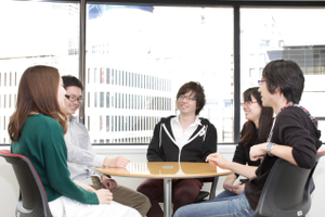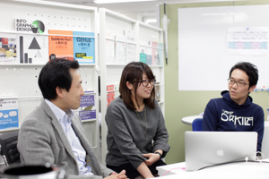 打ち合わせスペースでの座談会のひとこま。エンジニアのための環境について考えています。