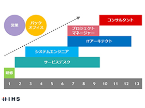日本のIT国家戦略を支える情報処理推進機構(経済産業省)の仕組みに沿った人事制度を構築。社員のスキルを体系的に管理し、7つの役割※と段階的なステップを用意して、社員が成長しやすい環境を整えています。 ※研修生、サービスデスク、システムエンジニア、ITアーキテクト、プロジェクトマネージャー、コンサルタント、営業