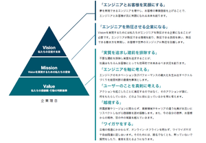 ■実質を追求し建前を排除する 不要な建前を排除し実質を追求することが、 社員はもちろんお客様にとっても効率的で本来あるべき状況を創ります。 ■エンジニアを軸に考える エンジニアのモチベーション及びパフォーマンスの最大化を生み出すベクトルづくりを 経営判断の最優先事項とします。 ■ユーザーのことを真剣に考える アクションを起こしたことに満足するのではなく、 そのアクションが誰に、何をもたらしているか、どのように役に立っているかを常に考えます。 ■越境する 所属部署やリージョンに関わらず、業務領域やキャリアの違う社員が お互いにリスペクトしながら価値観を認め協働します。 また、今の自分の限界、お客様からの期待、世の中の常識を越えていきます。 ■ワイガヤをする 立場の相違にかかわらず、オンライン・オフラインを問わず、ワイワイガヤガヤ自由闊達に話し合います。そのためには、匿名でなくとも、黙っていないで質問をしたり、意見を言えるようになります。