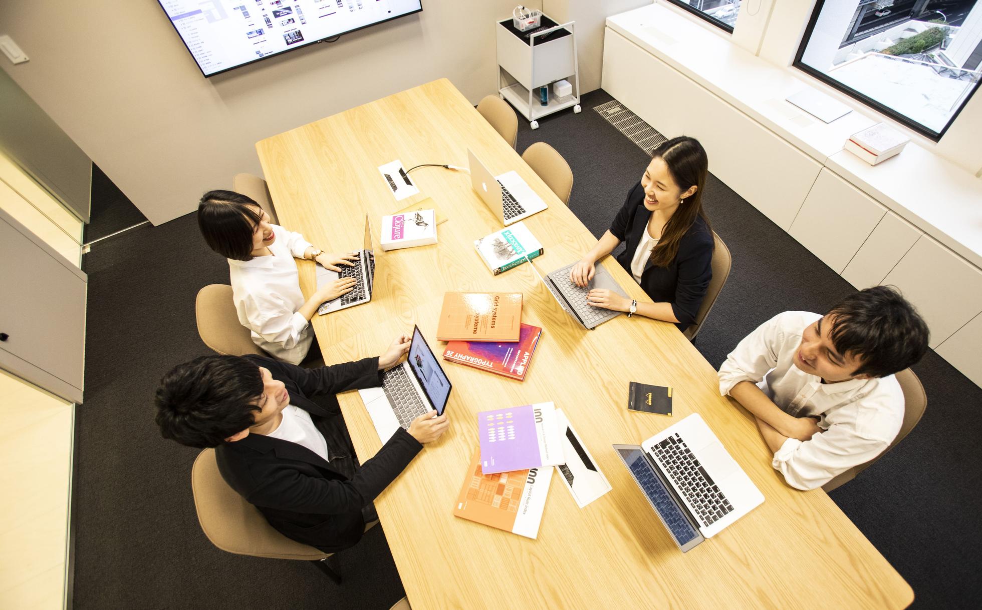 Gunosy社員の専用エリアは完全フリーアドレス制で、全席にディスプレイを完備しています。
