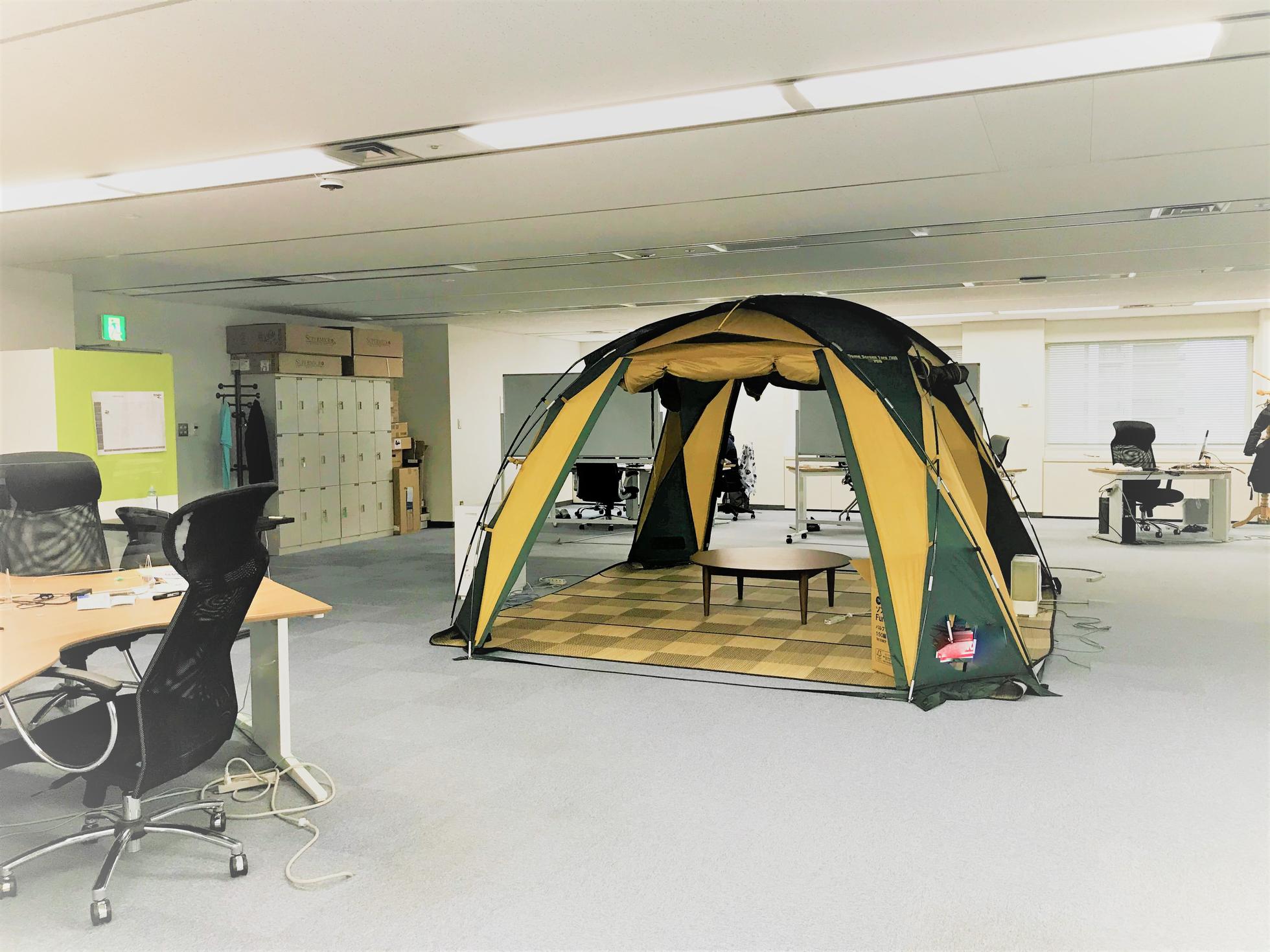 札幌R&Dセンターのエントランスです。オフィス内にはあちこちにフクロウがいたり、卓球台やキャンプ用のテント、ちゃぶ台等もあります