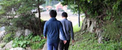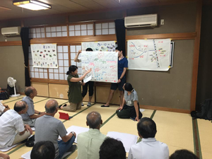 大学生と地域の人をつなぐ「まち冒険」でインタビューをしている様子です