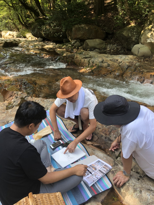 松野町、滑床渓谷での青空MTGの様子。各プロジェクトは、サン・クレア社員だけではなく、プロジェクトへ強い共感をいただいた、各プロフェッショナルが集まって進んでいきます。参画している方は、会社名ではなく、個人の名前で商売/勝負をしている方ばかり。