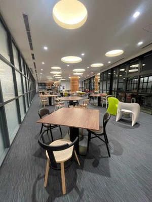 GMOhinataの「GMO Yours」には様々な形の机やテーブルが並びます。