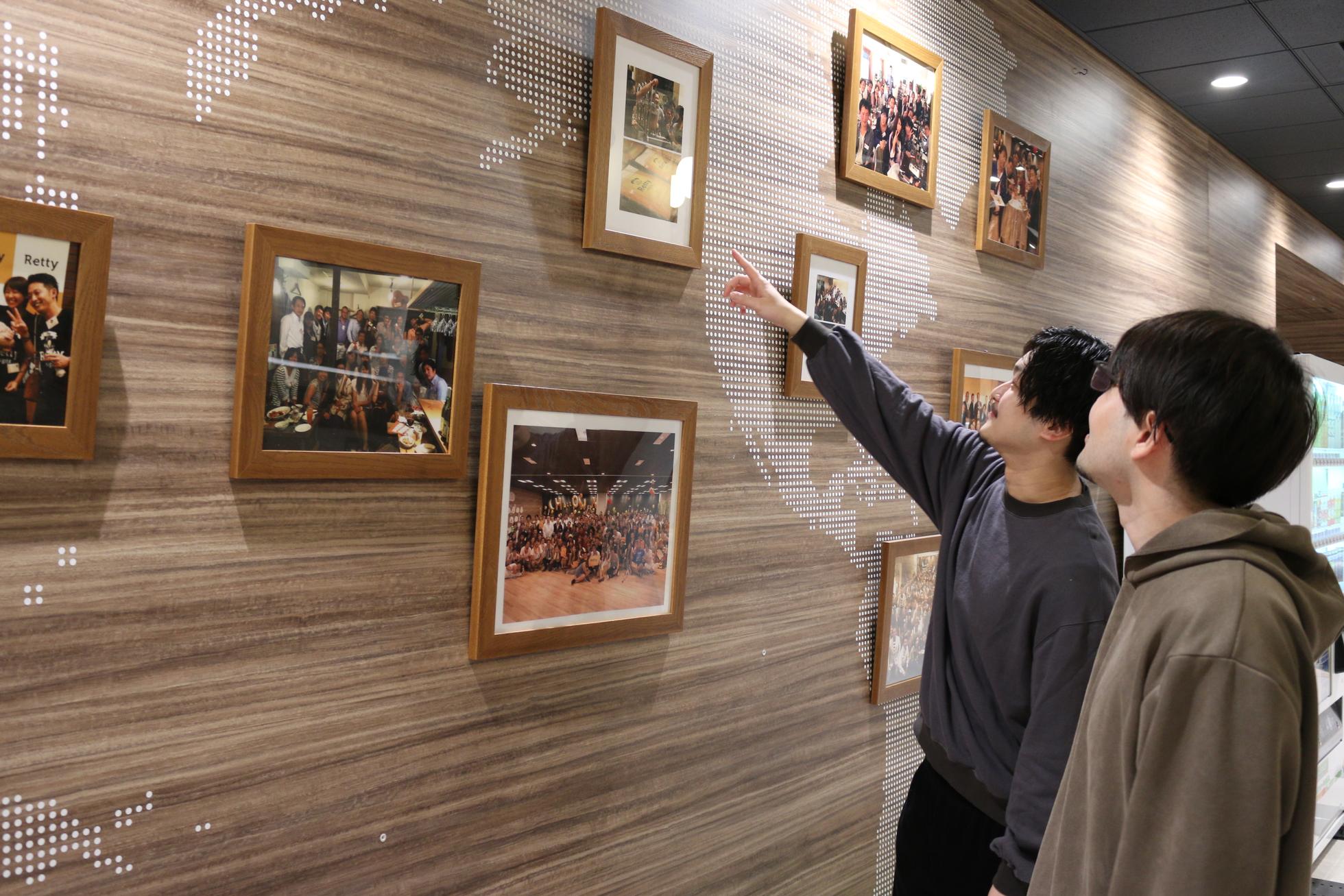 UserHappyを大事にするRetty。オフィスの壁には今までユーザーさんと撮影した写真がたくさん。webサービスながらもユーザーさんと近い距離で働けるRettyだからこそ何のために。誰のために。仕事をしているのか、感じることができます。