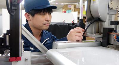 メカ/ソフト/エレキエンジニアが強力なチームワークで開発を進めています。しっかりとしたワークスペースの確保やフレックスタイム制など、ものづくりに専念できる環境を整えています。