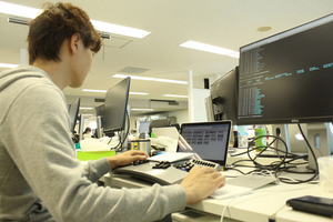 どこで開発するのも自由。自席はプロデューサー、アナリストなどが近くにいてすぐに連携できる環境です。