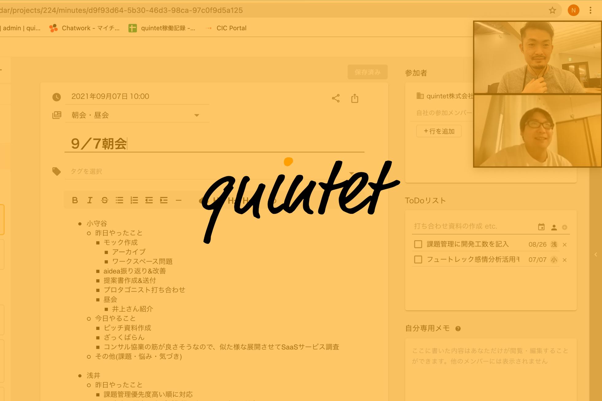 2019年にquintet株式会社創業し、いまはMTGメモDX SaaS「One Minutes」の開発・運営をしています。 打ち合わせや社内に蓄積している様々なデータを要約することで、組織・個人の生産性向上につなげます。 https://9uintet.com/