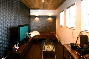 外国の都会のレトロ感をイメージしたお部屋の事例。レンガ調のエコカラットと白と黒のクロスを大胆に使用し、天井と床をダーク色のクロスとフローリングで統一。新しく三連の上げ下げ窓を設置しました。