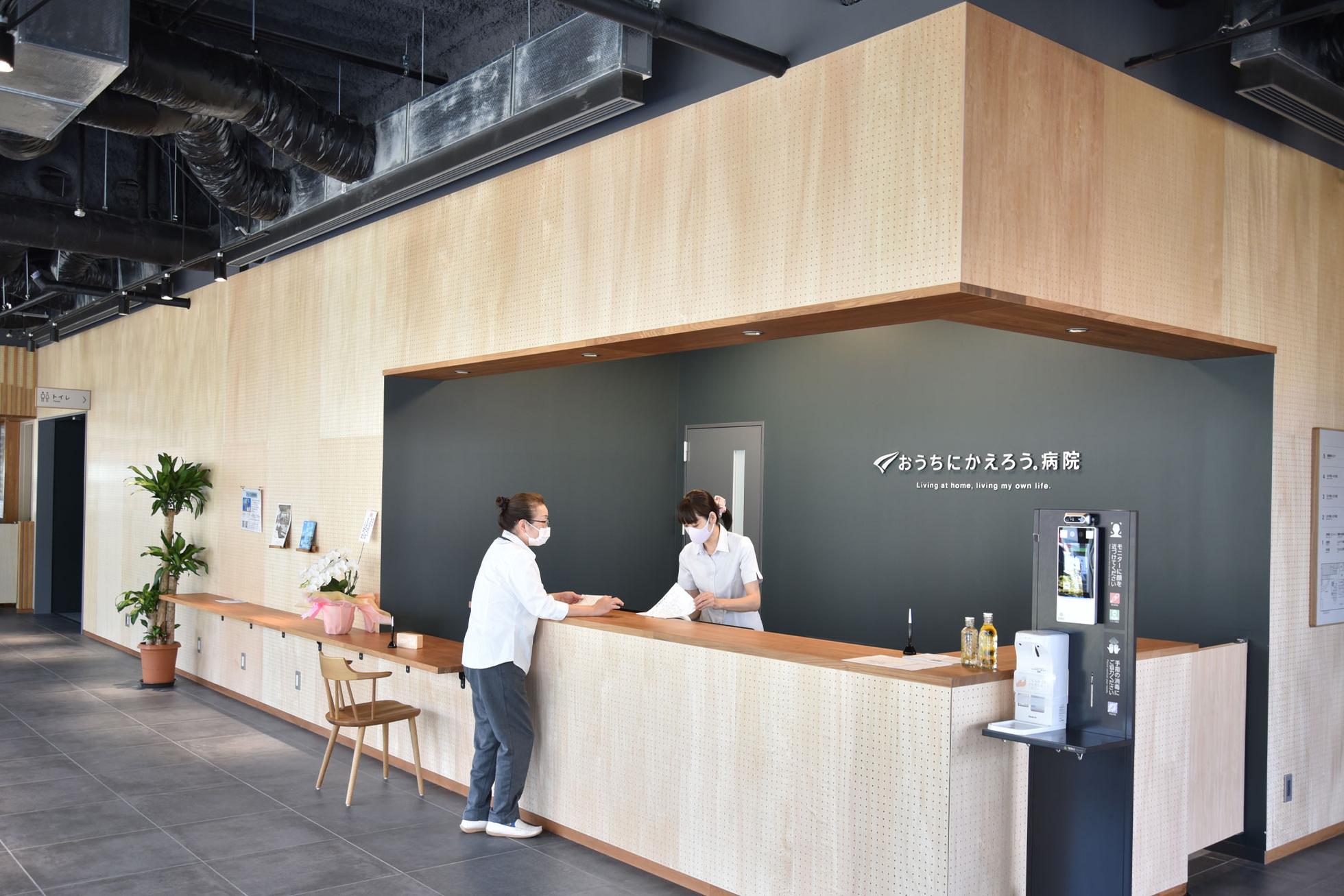 おうちにかえろう。病院の1階。外の名世界と病院内の世界とをつなぐようなデザインは、「病院」という閉鎖的なイメージを払拭し、患者様と地域とをつなぎます。患者様が過ごしやすいように、スタッフが働きやすいように、院内各所に様々な工夫と、想いが詰まっています。(撮影場所:おうちにかえろう。病院1階)