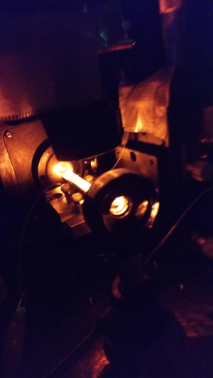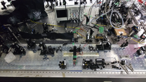 量子光源。量子通信に使われる光子(フォトン)はこのような比較的大きな装置から生成されます(画面中央に定規を配置しました)。光子を数枚のミラーで閉じ込め、通信に使えるもののみを選び出して発射します。