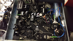 短距離量子通信システム。レーザーや量子もつれ発生装置、検出器、干渉計等が緻密な計算により1つの箱(19インチラック用)に詰め込まれています。持ち運び可能なシステムです。