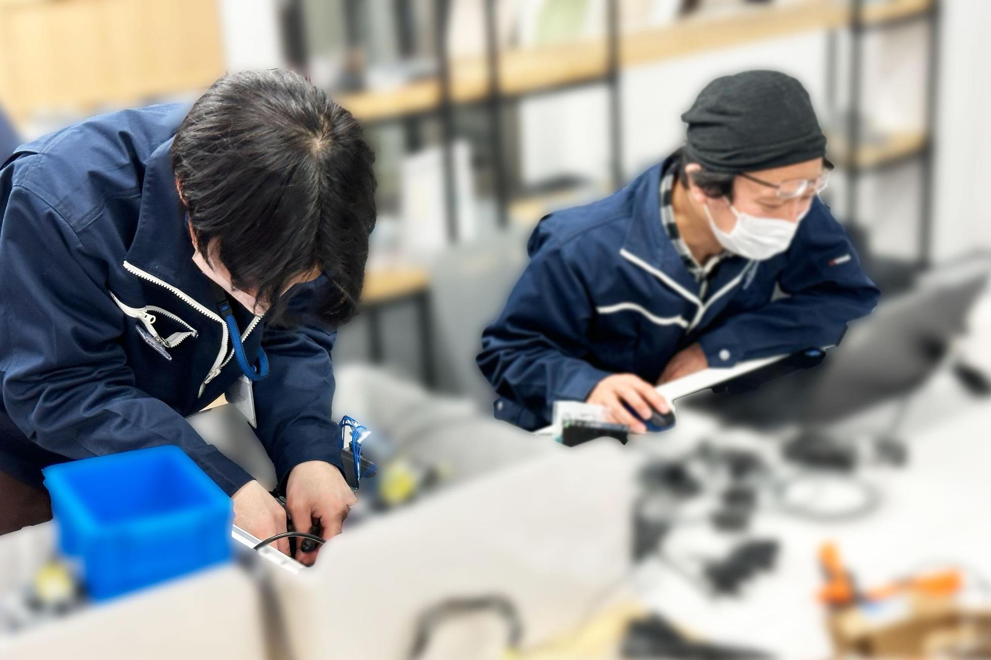 メカ/ソフト/エレキエンジニアが強力なチームワークで開発を進めています。しっかりとしたワークスペースの確保やフレックスタイム制など、ものづくりに専念できる環境を整えています。