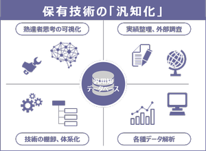 “汎知化”とは、熟達者(スペシャリスト、エキスパート)が持つ経験や知見、洞察の視点を次世代につなぐため、その人が持つ 「専属知、専門知」 を後世の人々にとって分かりやすい活用形体に変換することです。自社として残すべき技術の全体像を把握し、その原理原則に着目した整理や “情報化” を行うことで、ベテランの知を次世代の業務基盤に組み込むことが可能となります。
