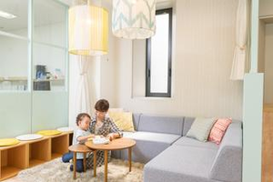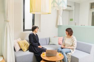 オフィスは土足禁止で使用しています。明るく清潔で、リラックスした雰囲気。子どもと一緒にくつろげるソファスペースもあります。
