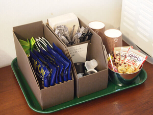 フリードリンク(水、コーヒー、紅茶、日本茶)とお菓子を完備
