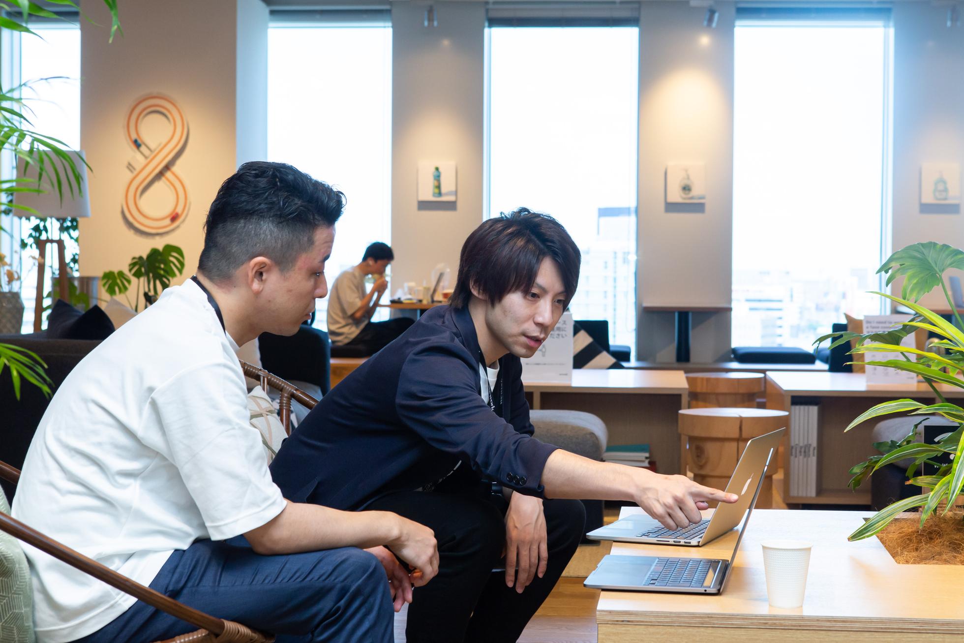 私たちが入居しているWeWork名古屋での風景です。とてもおしゃれな空間でリラックスして仕事ができます!(左)CEO 城山 (右)CSO 清水