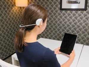 リラクゼーションにおけるリラックス度の深さを脳情報で測っている様子