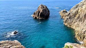 高知県足摺岬にあるホテルからの景色。海の深い青は足摺ブルーと呼ばれ、天気が良い日はウミガメを見ることもできる。