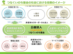 ​公益財団法人つなぐいのち基金は、 連携・協働・啓発、高齢者と子どもの相互扶助の関係作りなどを推進する (つなぐ)こととで、社会効率を高め、 次の世代へより良い社会を「つなぐ}ことを目指す公益法人です。 代表的な2つのつなぐは、「多世代をつなぐ」、「支援者と活動団体をつなぐ」 つなぐのが得意な方も、すぐにつながれてしまう人も、ご応募お待ちしています。